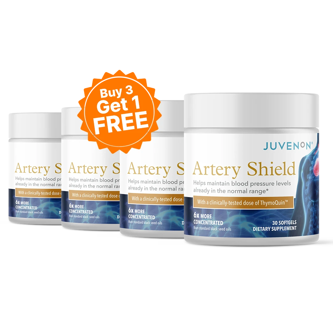 A: Artery Shield contains the first cold-pressed black seed oil standardized to 3% thymoquinone, the active ingredient in black seed oil. Artery Shield lowers high-normal blood pressure by acting on four pathways in the body that cause increased blood pressure. Artery Shield helps widen blood vessels narrowed by age. It strengthens and promotes flexibility in arteries that become stiff and hard. It fights inflammation and it helps reduce free radicals that damage the delicate inner lining of the arteries.