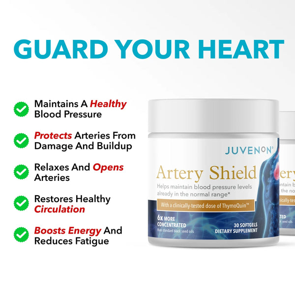 Artery Shield contains the first cold-pressed black seed oil standardized to 3% thymoquinone, the active ingredient in black seed oil. Artery Shield supports optimal blood pressure by acting on four pathways in the body that cause increased blood pressure. Artery Shield helps widen blood vessels narrowed by age. It strengthens and promotes flexibility in arteries that become stiff and hard. It supports a healthy inflammatory response and helps reduce free radicals that damage the delicate inner lining of the arteries.