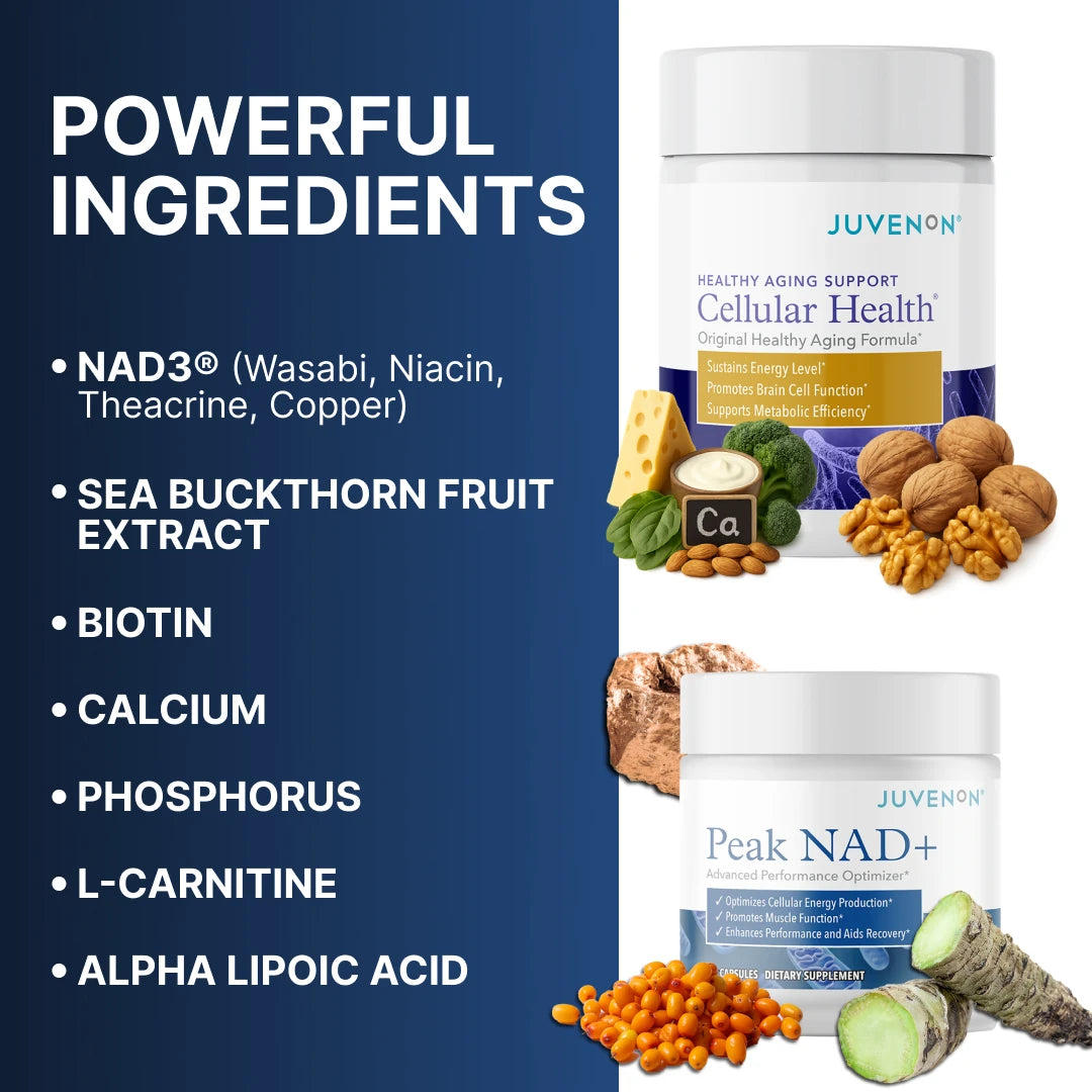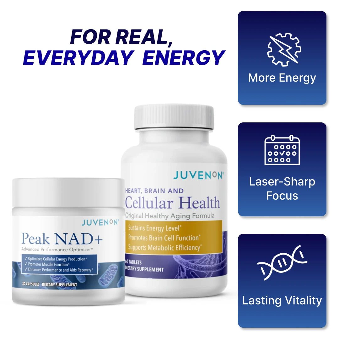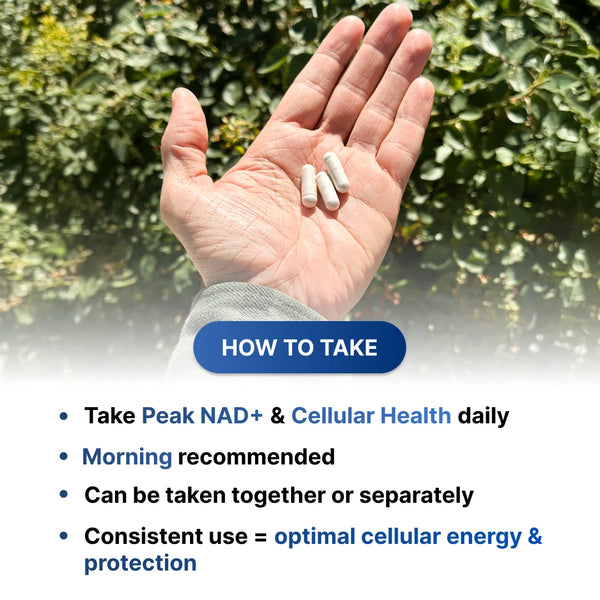 When used together, they create a powerful synergy: Peak NAD+ restores your cells' ability to make clean energy, and Cellular Health protects and nourishes those cells so they can perform at their best.