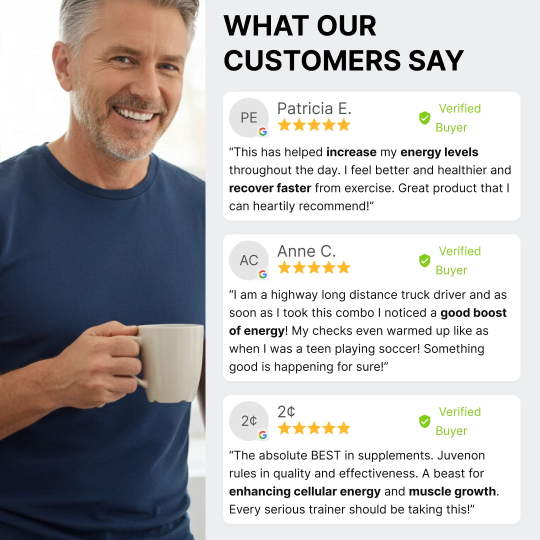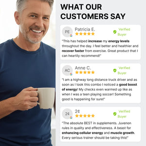 At Juvenon®, we believe in the effectiveness of our products. That's why we offer a straightforward 60-day money-back guarantee. If you're not over-the-moon ecstatic about the steady energy you feel all day long, we've got you covered. It's a risk-free opportunity to experience the benefits of our formulas and prioritize your well-being. Your journey to a healthier you starts here, worry-free.