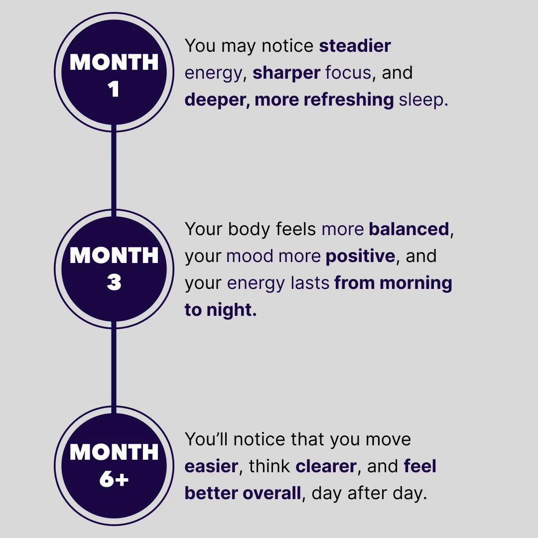 By month three, that newfound energy starts to feel like your new normal. Your cells are now stronger and more efficient, and your mitochondria — the tiny “power plants” inside every cell — are running at full speed. You’ll likely feel sharper, think clearer, and recover faster from daily activity. Your body feels more balanced, your mood more positive, and your energy lasts from morning to night. You’re not just getting by — you’re hitting your stride.