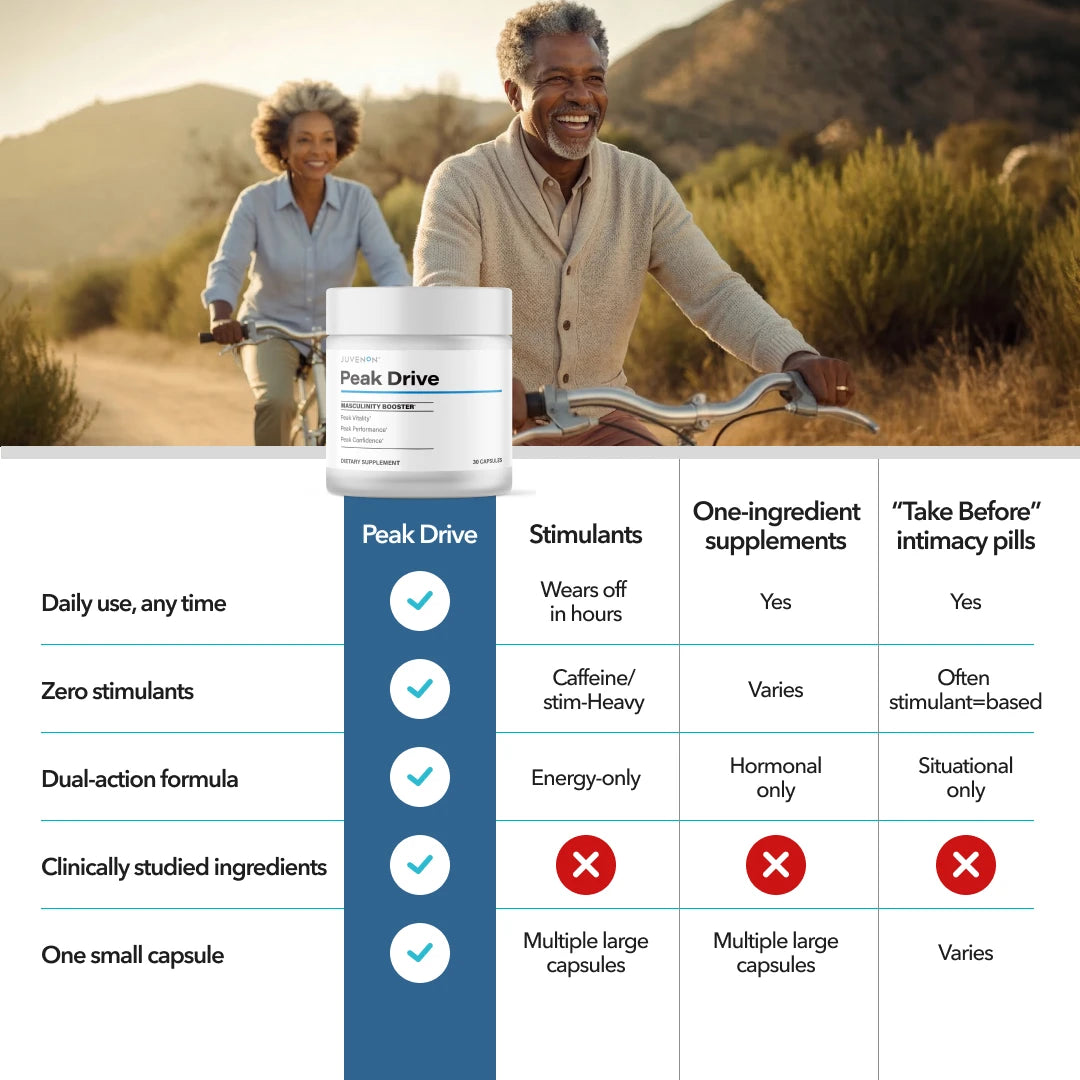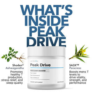 Peak Drive®Peak Drive® supports male vitality and maximizes male drive — physical, emotional, and mental. It helps maintain healthy hormonal balance within normal ranges while supporting mental clarity, stress resilience, and physical performance — all without stimulants.