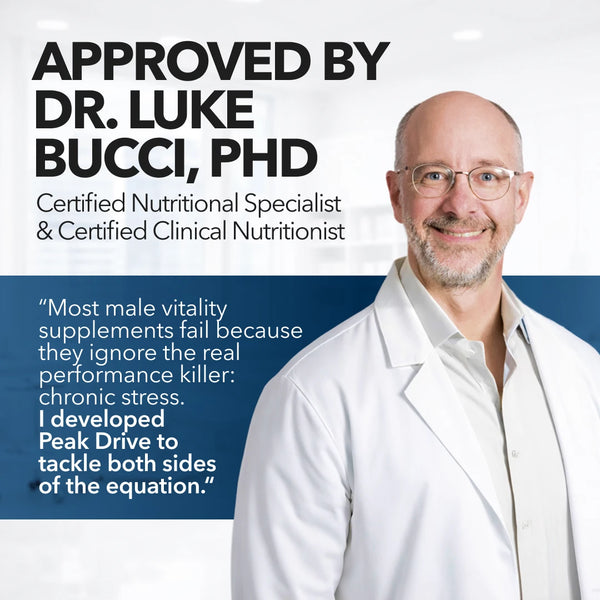 “Most male vitality supplements fail because they ignore the real performance killer: chronic stress. I developed Peak Drive® to tackle both sides of the equation. By pairing a potent performance botanical with high-bioactivity Ashwagandha, our dual-action formula supports natural hormonal balance while managing cortisol—the "silent killer" of energy and focus.