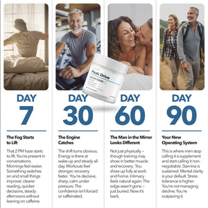 Because Peak Drive® supports natural physiological processes, results build over time. Some men report improvements in focus and resilience within a few weeks. Human studies have found significant improvements after two weeks of use. For deeper vitality support, consistent use for 8–12 weeks is recommended. Consistency matters.