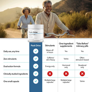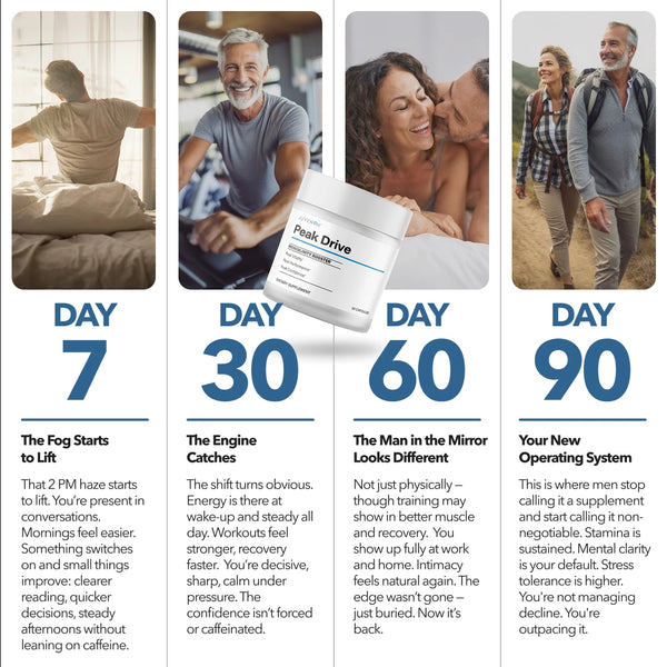 Instead of forcing a temporary spike, Peak Drive® restores the internal environment your body needs for sustained energy, sharper thinking, and faster recovery. No stimulants, no complex protocols—just one daily capsule designed for compounding results.”